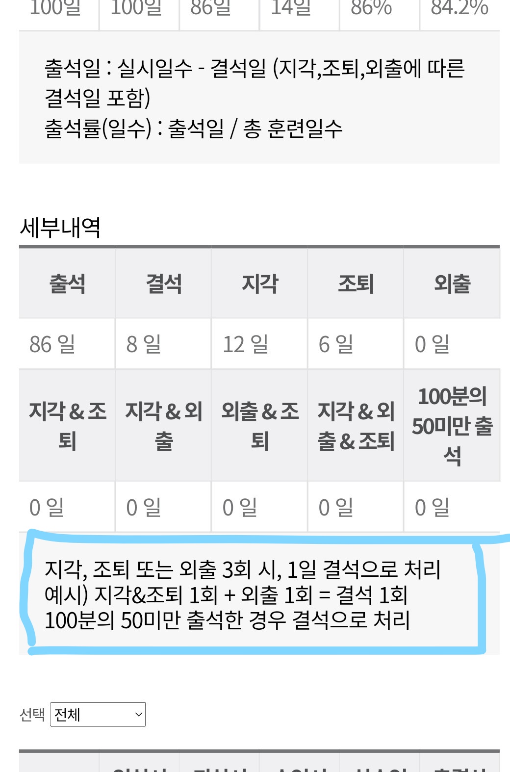 국비학원 출결앱을 보면 50퍼센트 이하 출석이면 결석 처리된다고 되어있다.