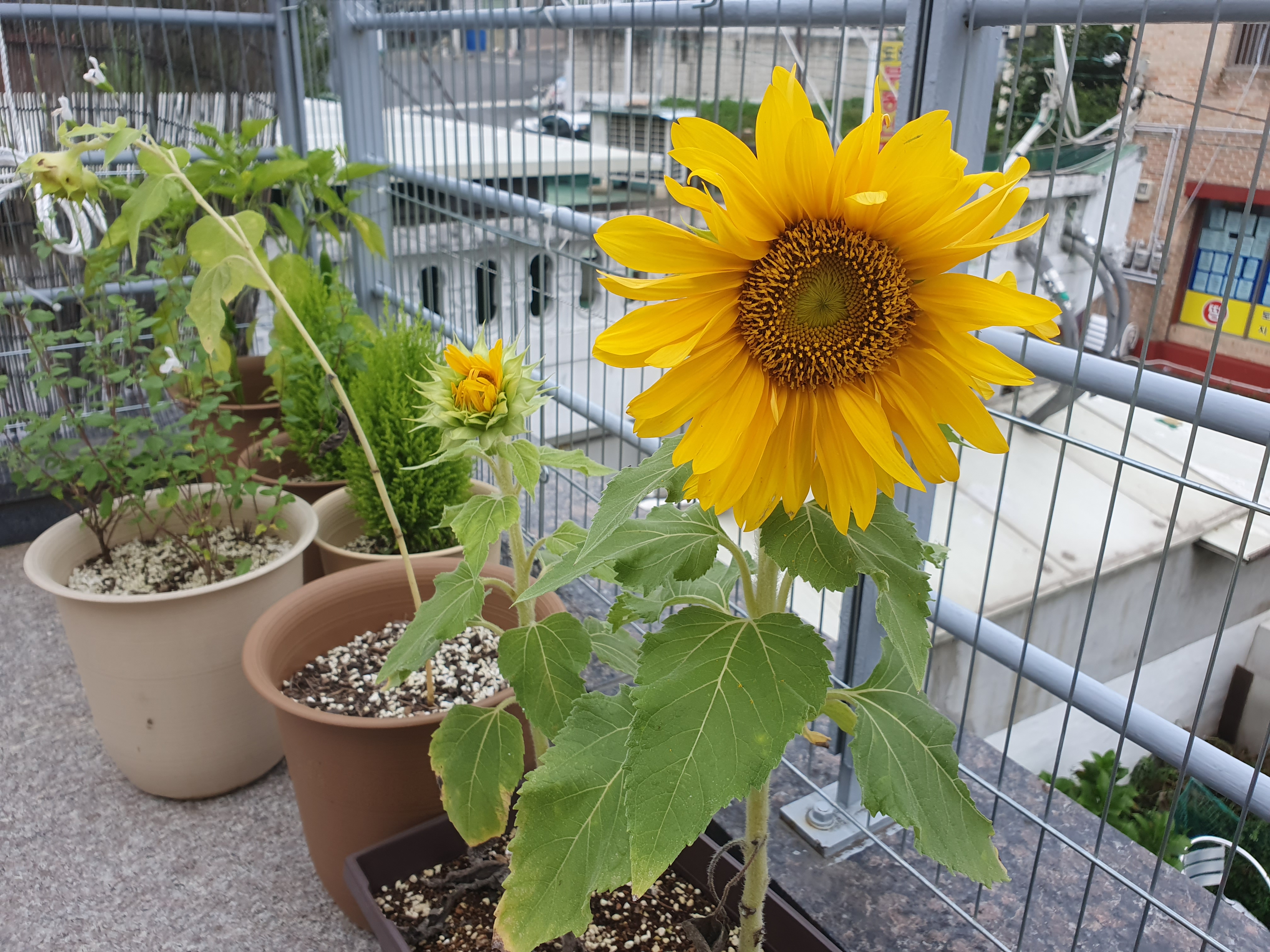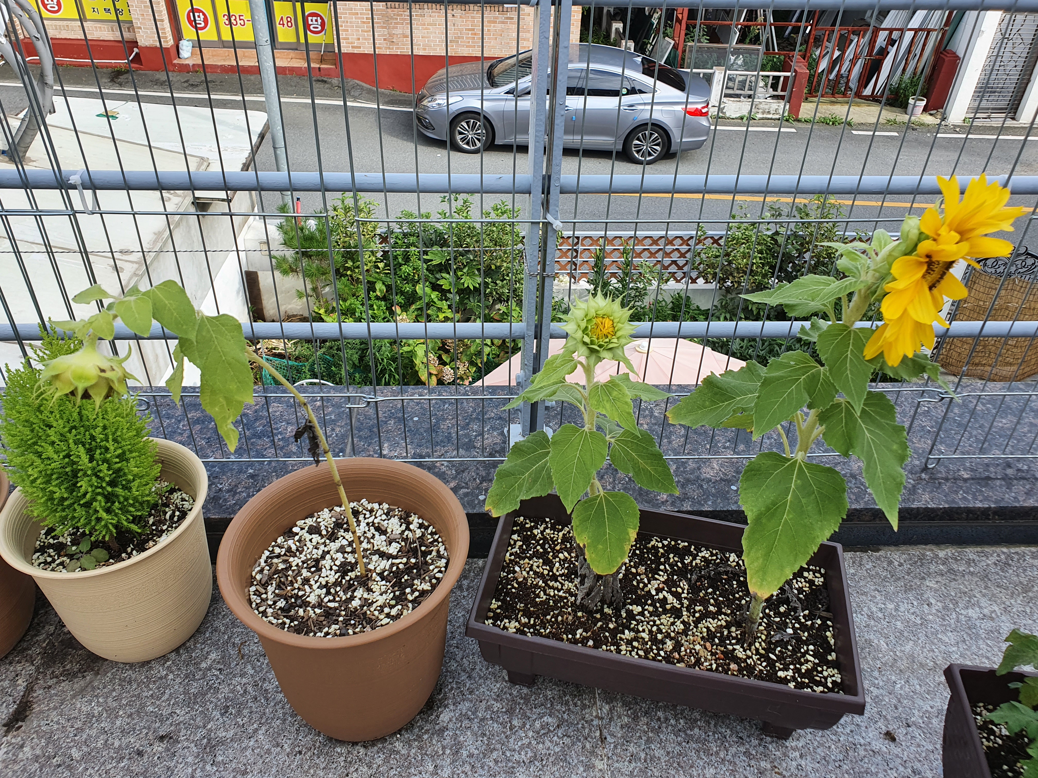 그래도 원래 해바라기가 작지 않은 식물이니까요. 전에 마당에서 키우니까 2미터 넘게 자라더라고요. 해바라기 지고나서 꽤나 처치곤란이었죠.
