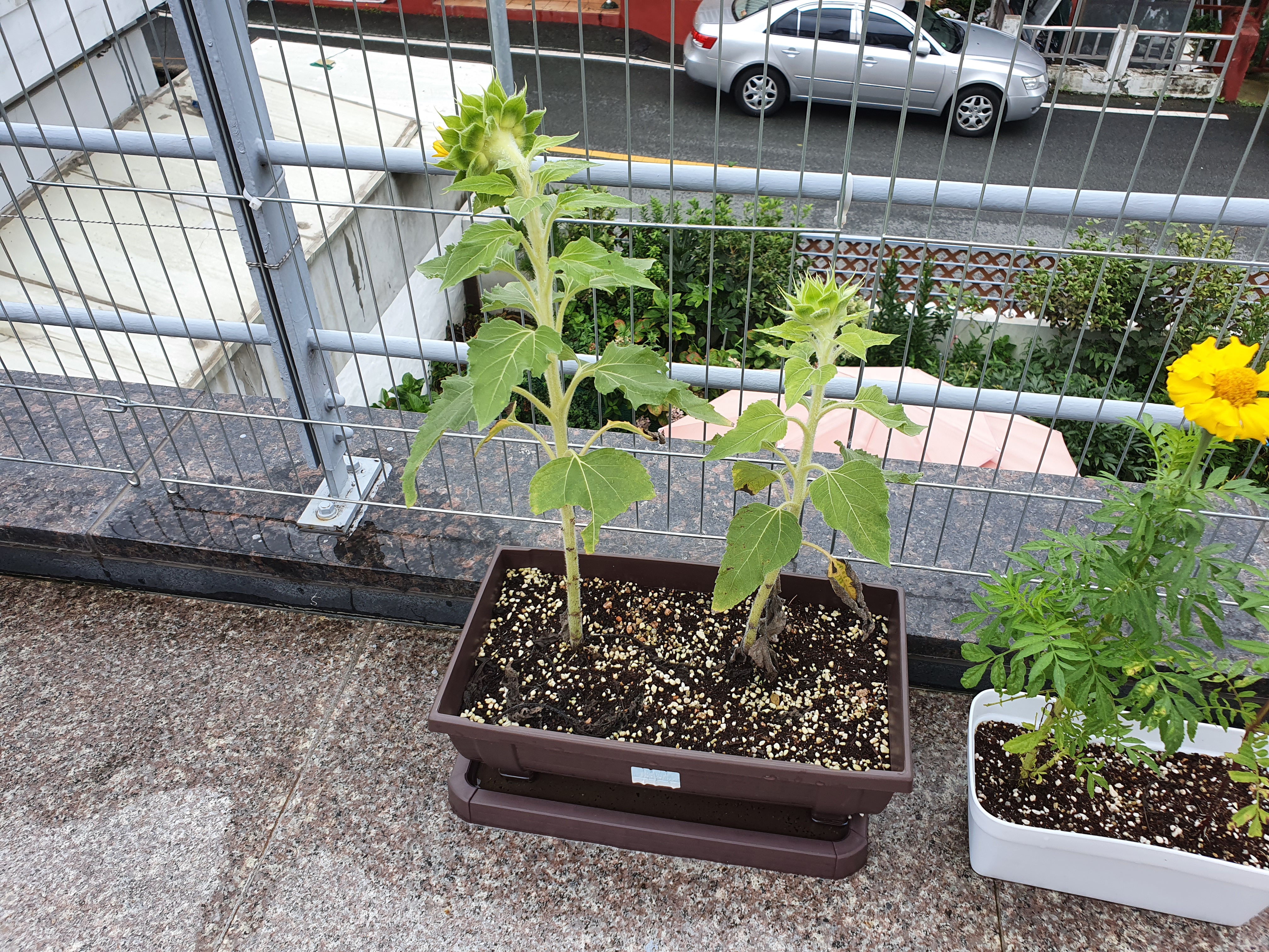 왼쪽 화분도 해바라기인데요. 이 해바라기는 이미 꽃이 피었다가 졌어요. 이거는 비실비실하죠?
